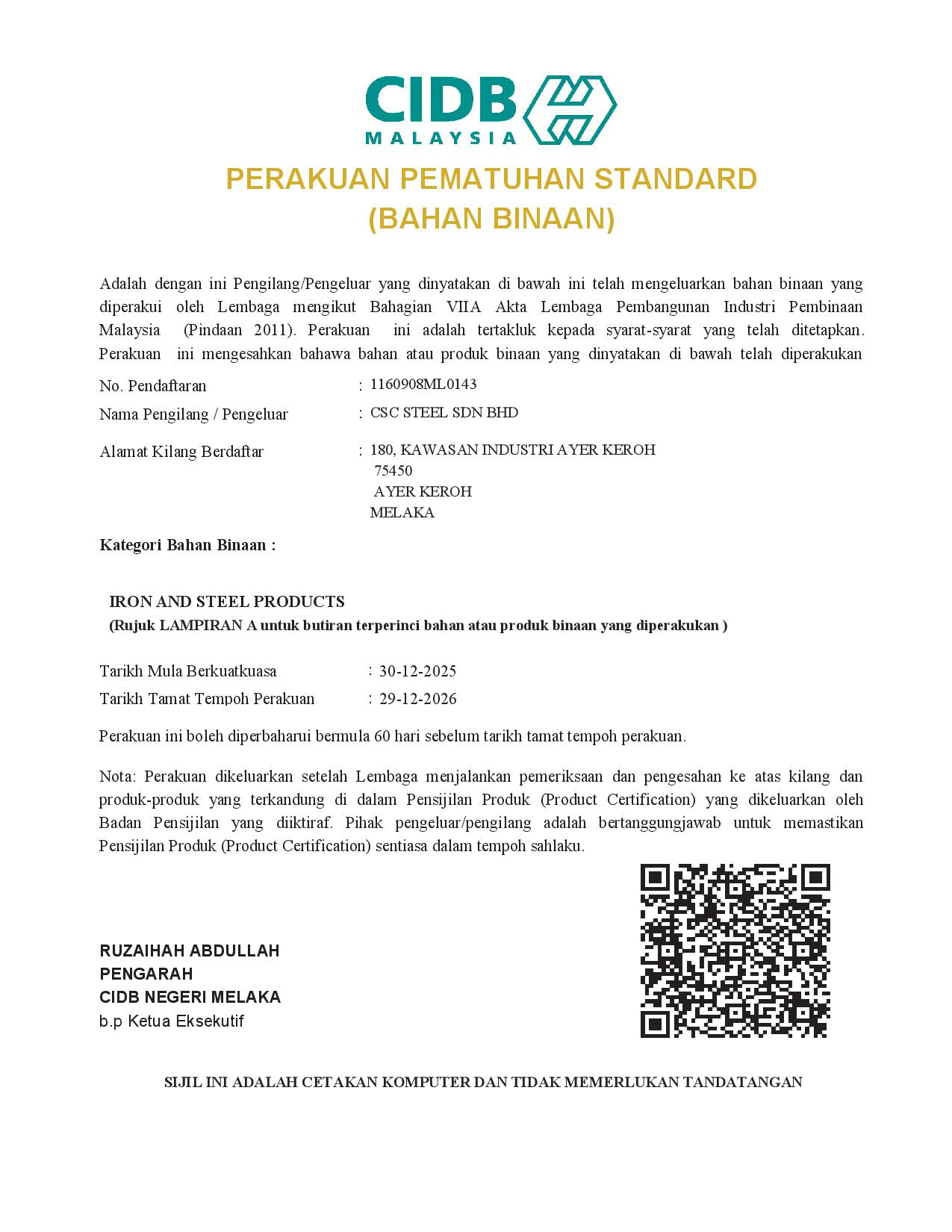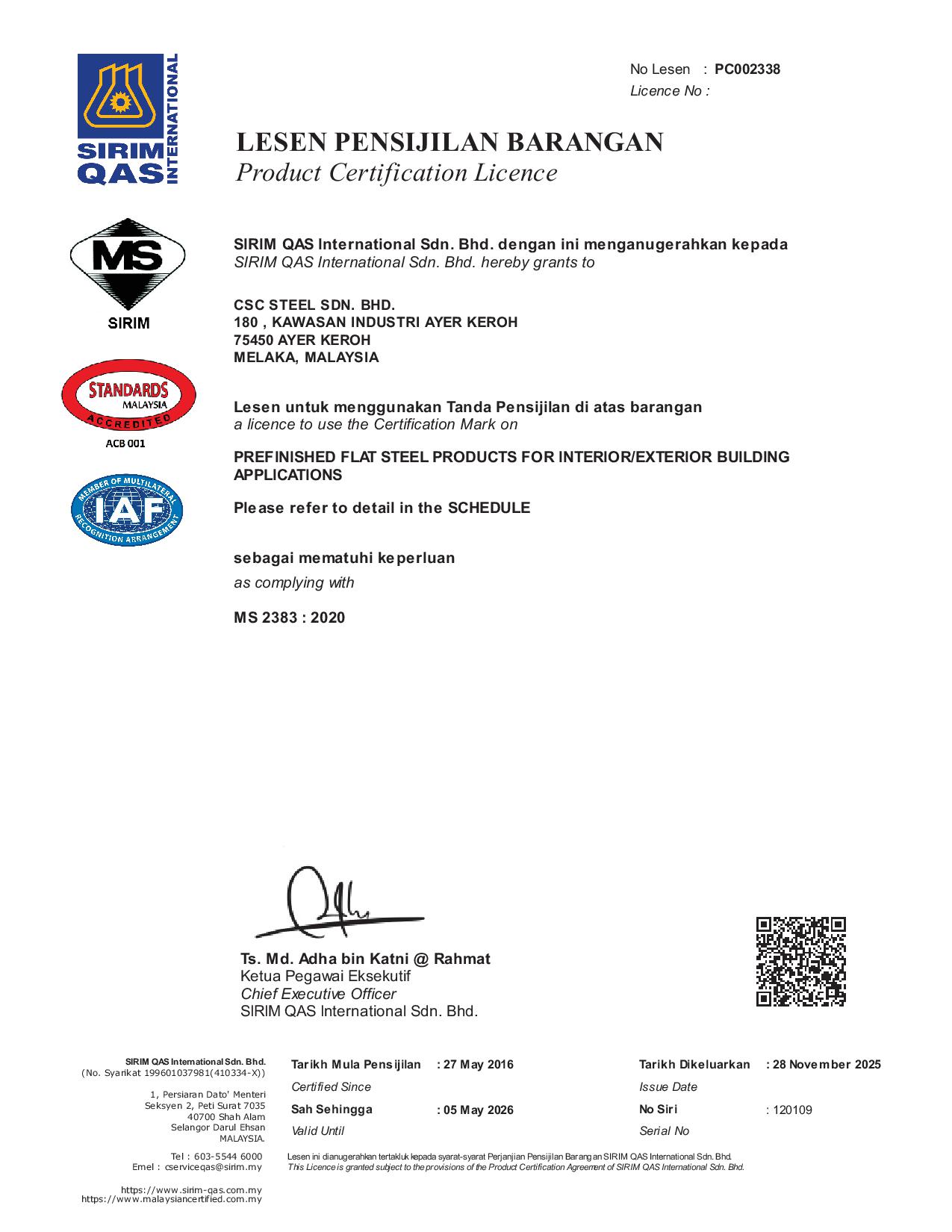 In 2016, CSC Steel’s realcolor® product had been accredited with MS2383 product certification by SIRIM QAS International Sdn. Bhd. Certification Mark granted under SIRIM QAS International’s product certification scheme confidently tells our customer that our product has undergone thorough assessment and subjected to a program of supervision and control before they are ready to be used.